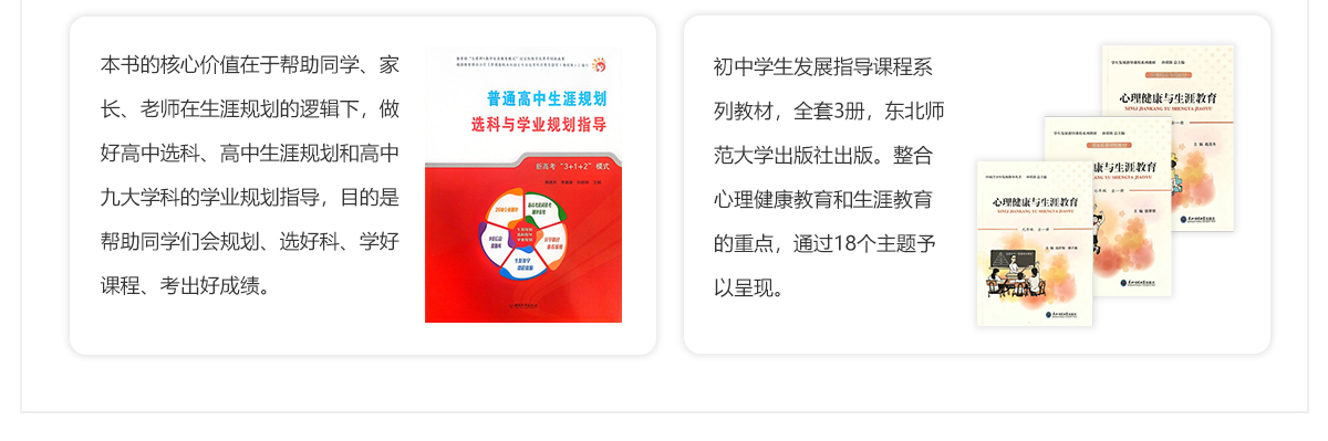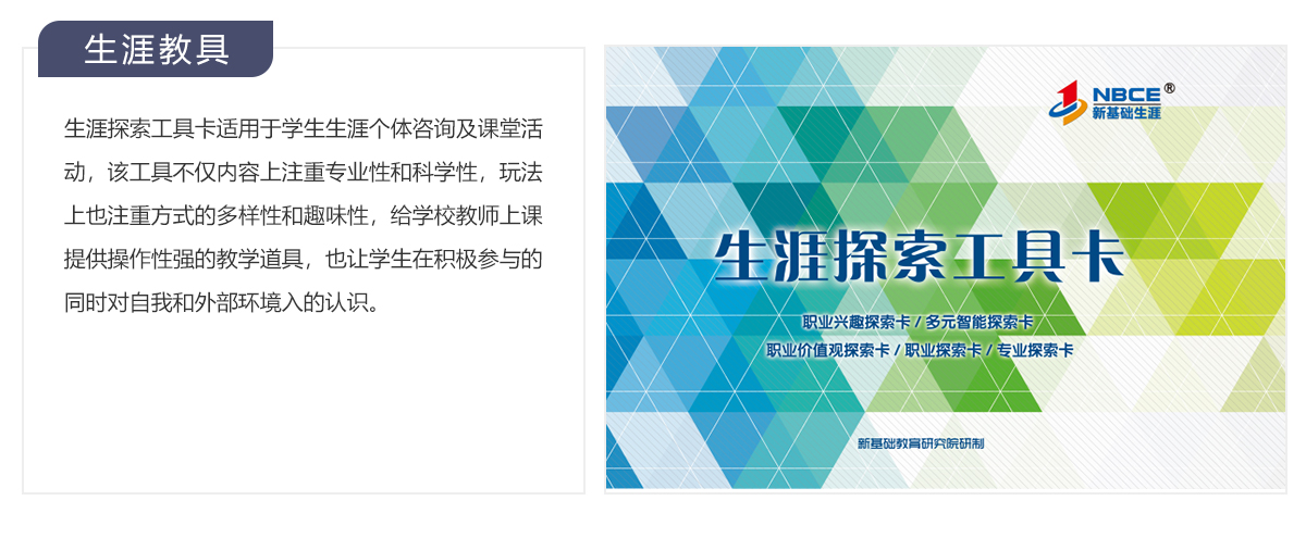 为了满足学校有效开展学生发展指导教学课程、建立生涯指导教学体系、实现学生发展指导教学目标、培养学生核心素养等需求,新基础生涯开发了生涯教育课程教材、教具及课程资源包等,结合学校教育理念及办学特色,协助学校建设生涯发展指导课程体系、学科融合课程体系、生涯特色活动等。