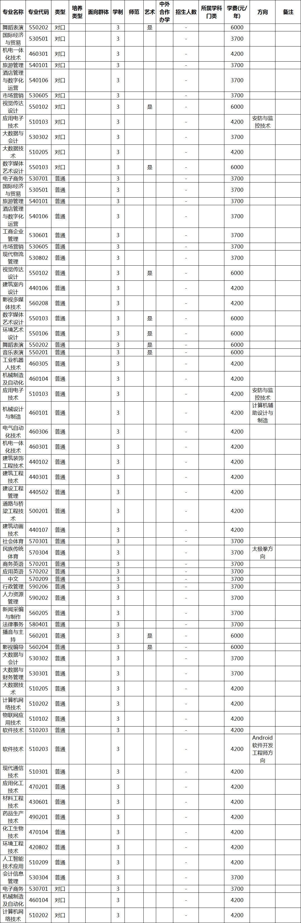 开设专业:电气自动化技术、应用电子技术、机械制造与自动化、汽车技术服务与营销、计算机辅助设计与制造、工业设计、计算机应用技术、计算机信息管理、计算机网络技术、通信技术、软件技术、建筑工程技术、建筑装饰工程技术、建筑工程管理、应用化工技术、工业分析与检验、环境监测与治理技术、商检技术、材料工程技术、生物化工工艺、经济管理、国际经济与贸易、市场营销、会计电算化、电子商务、旅游管理、酒店管理、物业管理、物流管理、文秘、涉外旅游、新闻采编与制作、汉语、行政管理、旅游英语、商务英语、应用英语、法律事务、公共事业管理、装潢艺术设计、电脑艺术设计、影视多媒体技术(08年开始招生)、室内设计技术(08年开始招生)、新闻采编与制作(播音与主持方向)、舞蹈表演、社会体育(太极拳方向)等46个专业。